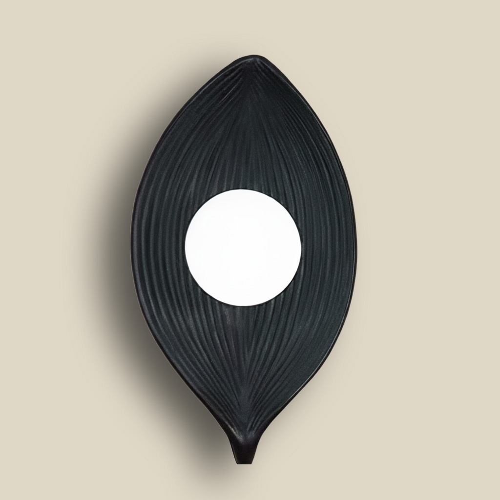 A modern wall light from Prince Pro, featuring a sleek longitudinal leaf design (resembling a lotus petal) in bright white. It is centered with a spherical light unit that provides a soft glow, highlighting the leaf’s textured details. An artistic choice for lighting hallways or as bedside accents in contemporary bedrooms.