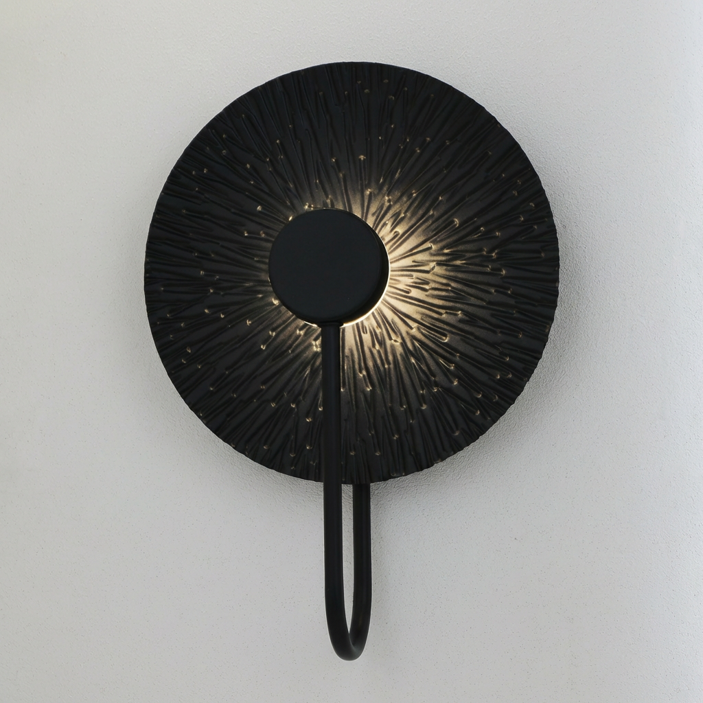 A modern wall light from Prince Pro featuring a luxurious circular design in matte gold with a textured surface reminiscent of sunbeams. It provides a warm backlighting effect that highlights its intricate engravings, creating an atmosphere of luxury and serenity. Ideal as a statement decorative piece for reception rooms, sofa backdrops, or upscale hallways.